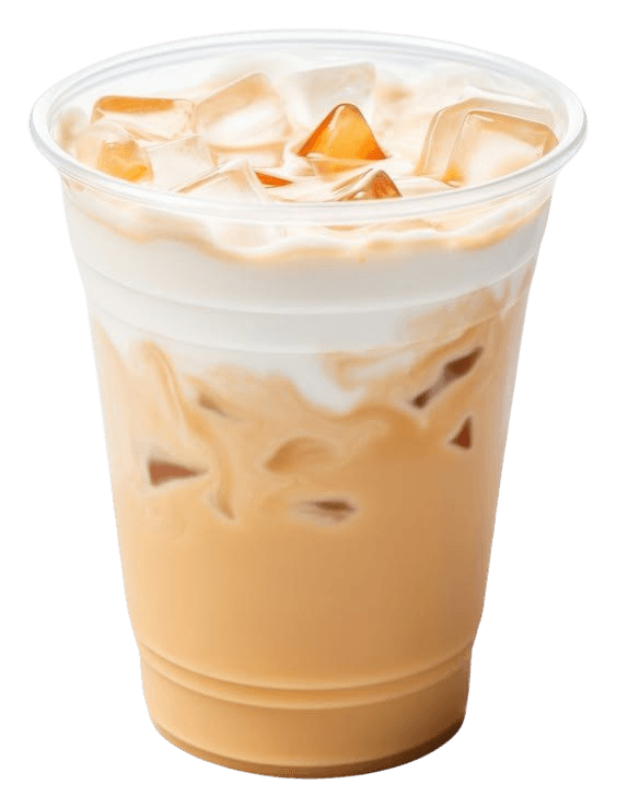 یک آیس لاته شیرین با طعم وانیل که روی آن با سس کارامل و یک لایه فوم شیر سرد تزیین شده